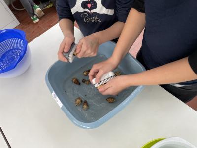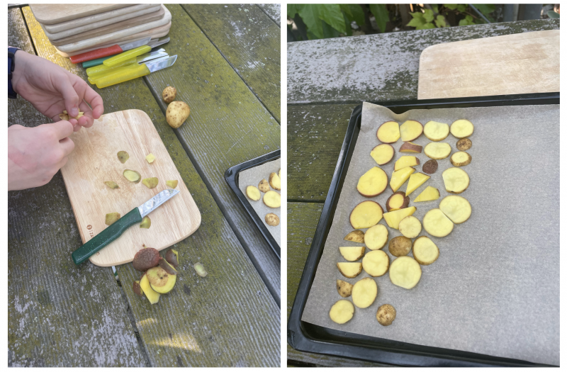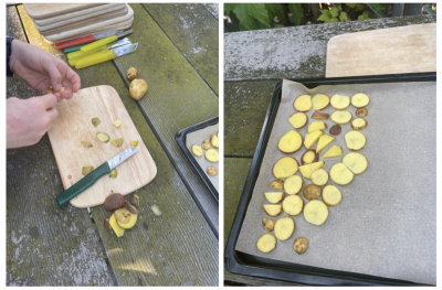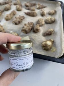 Heute haben wir in der Garten AG Kräutersalz aus im Sommer gesammelten Kräuter gemacht und Topinambur gebacken und gegessen.