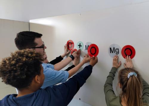 Für den Chemieunterricht benötigen wir über die Schuljahre grundlegende chemische Formeln. Zum Üben und Einprägen sollen diese Formeln im Chemieraum jederzeit gut sichtbar ausgestellt sein. Die Lernenden sollen die Symbole spielerisch anordnen und umgestalten können. Wir überlegten uns ein Design, das über Farben und Größen auf die Elemente schließen lässt. Unser Chemielehrer Herr Groß besprach mit der Forschen-AG die auszuwählenden Reaktionsgleichungen. Einige davon kennen wir noch gar nicht, weil wir erst in der 7. Klasse sind.
